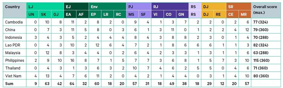 In Table 1, LJ=labour justice; EJ=energy justice; Env=environmental justice; PJ=procedural justice; RJ=recognition justice; RS=restorative justice; DJ=distributional justice; SR=structural reform. The sums in the rightmost column are the sums of all policy scores for each country, i.e. how much all the 8 to 10 policies scored. For example, all nine analysed policies in Cambodia combined scored 77 (out of a possible 324) [18 indicators × a maximum score of 2 × 9 policies]. The sums in the bottom row correspond to the total score for each indicator in all countries combined. For example, the indicator “restorative justice” (RS) scored 18 (out of a possible 144) [average of 9 policies × maximum score of 2 × 8 countries].