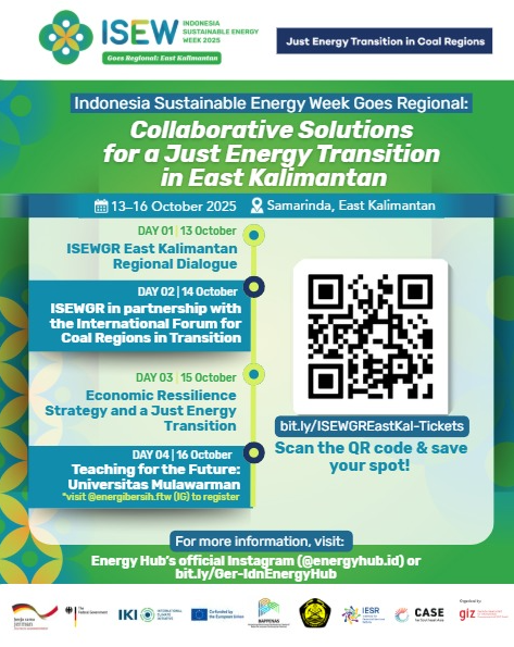The International Forum for Coal Regions in Transition forms part of the broader Indonesia Sustainable Energy Week Goes Regional (ISEWGR), taking place from 13–16 October 2025. While the Forum will be held on 14 October, ISEWGR also features sessions on 13 October (Dialogue on a Just Energy Transition at the Regional Level, hybrid) and 15 October (Strategies for Economic Resilience and a Just Energy Transition, hybrid until noon, in-person only afterwards). For the full agenda and updates on all sessions, please visit Energy Hub Indonesia.