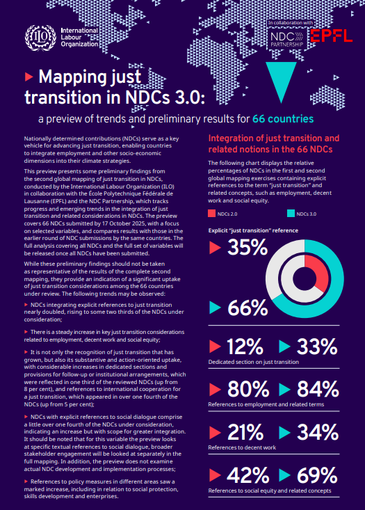 This preview presents some preliminary findings from the second global mapping of just transition in nationally determined contributions (NDCs), conducted by the International Labour Organization (ILO) in collaboration with the École Polytechnique Fédérale de Lausanne (EPFL) and the NDC Partnership, which tracks progress and emerging trends in the integration of just transition and related considerations in NDCs.