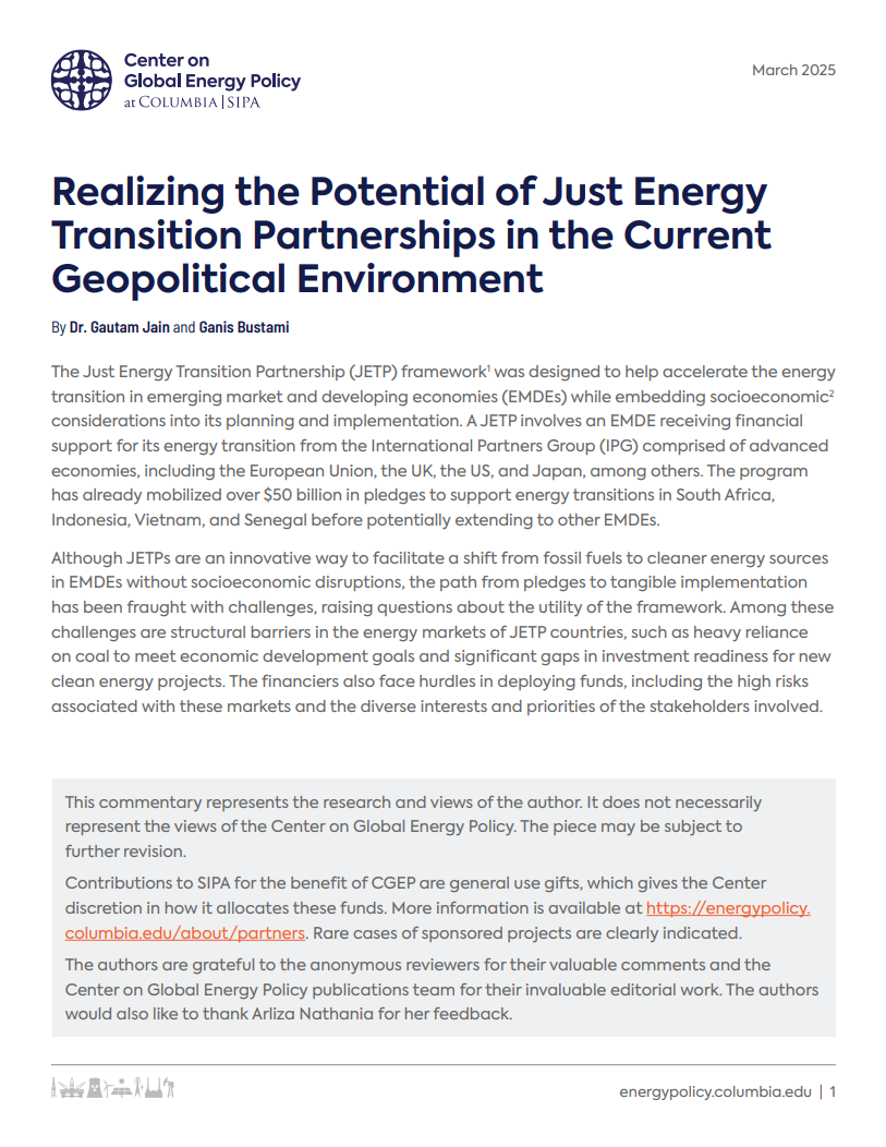 Published by the Center on Global Energy Policy at Columbia University, this commentary explores the factors that have hampered the implementation of Just Energy Transition Partnerships (JETPs) since their inception.